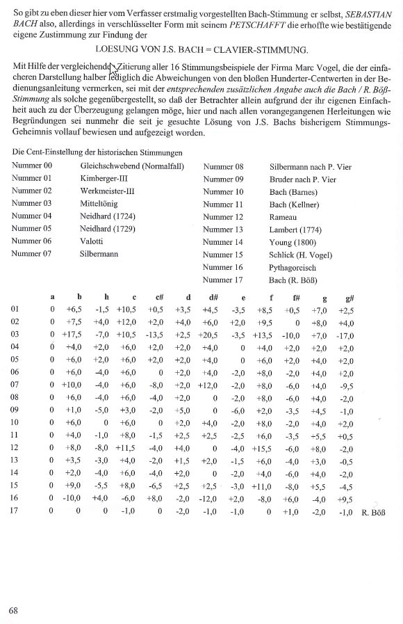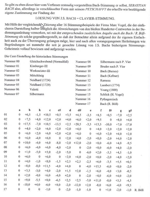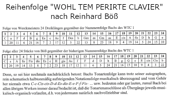 Mit dem Wohltemperirten Clavier schuf Bach ein Lehrwerk zur Temperatur, das weder mitteltönig noch gleichstufig ist, denn der Titel Das Wohltemperirte Clavier zeigt, daß die Stimmung die Grundlage zum echten Verständnis ist. Der Verfasser entschlüsselt Bachs Methode der Rätselnotation und dessen Devisen: Reinheit der Harmonien sowie eine Unterscheidbarkeit aller 24 Tonartencharaktere. Neben einer reinen Quinte verengt Bach die elf übrigen um 2,1,3 Cent laut den oberen Schnörkeln, die Bach auf das 24. Fugenthema bezieht. Der untere Schnörkel erklärt die Stimmwege, der Titeltext die Stimmtonhöhe, das Petschafft entziffert die genauen Unterschiede zur mechanistischen Gleichstufigkeit. Die neue Satzfolge beider Bände entsteht gemäß den Knospen des Brief-Siegels mittels Transpositionen um drei Halbtonschritte abwärts (1) oder vier Quinten aufwärts (2); Bach bestätigt mehrfach durch allerlei Hilfszahlen in typischen Takt- und drei Titeltextwerten diese Ordnung. So entsteht entgegen der «Originalnotation» mit ihren tonal doppelbödigen Gängen auch der gemeinte Zyklus.